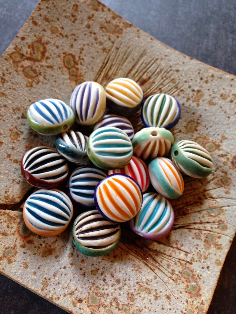 Deeply ribbed double sided beads in a circus of colors.